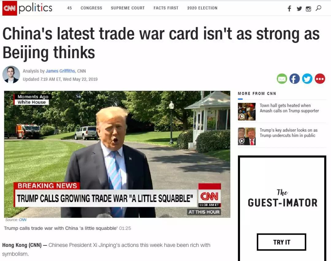 也有一些美國媒體沒那么悲觀。CNN就發表了一篇評論,稱稀土這張“貿易戰牌”沒有想象的那么強大。